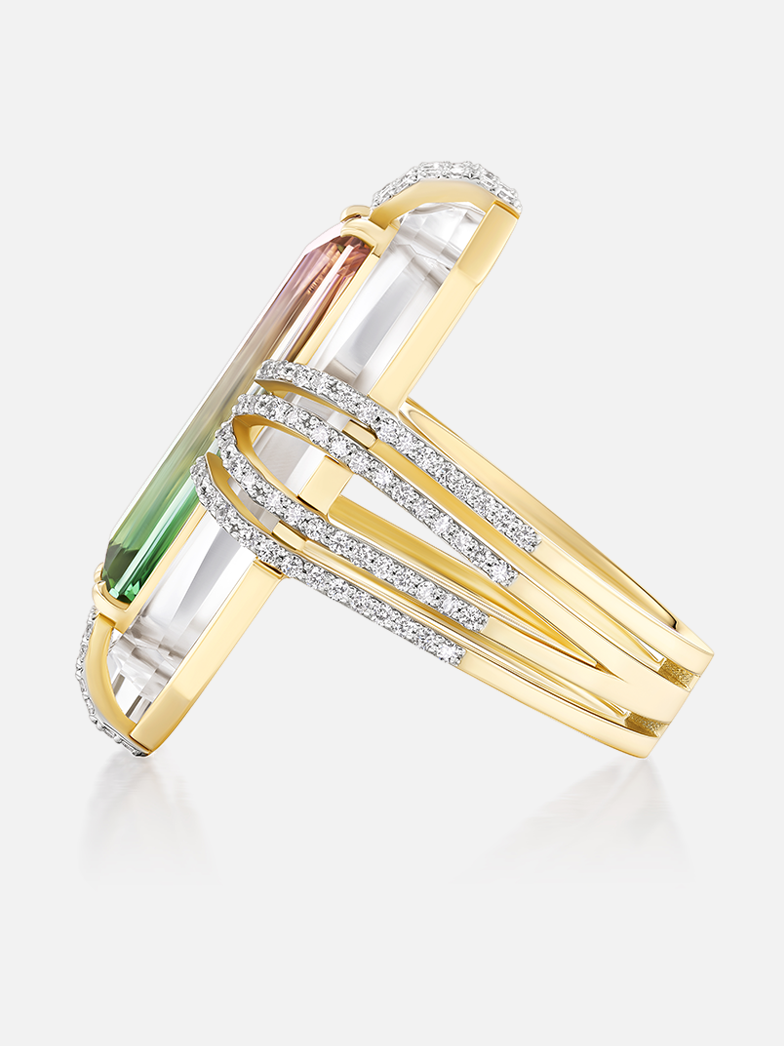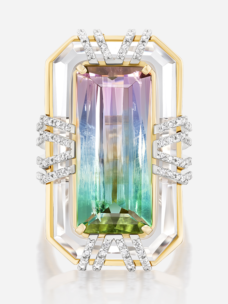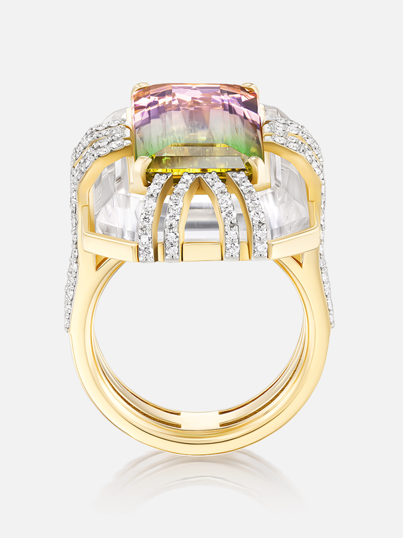 Uncommon Gems. One of a kind. 18k yellow Tie Dye 11.19ct Bi-Color Tourmaline Bianca Ring Size 6