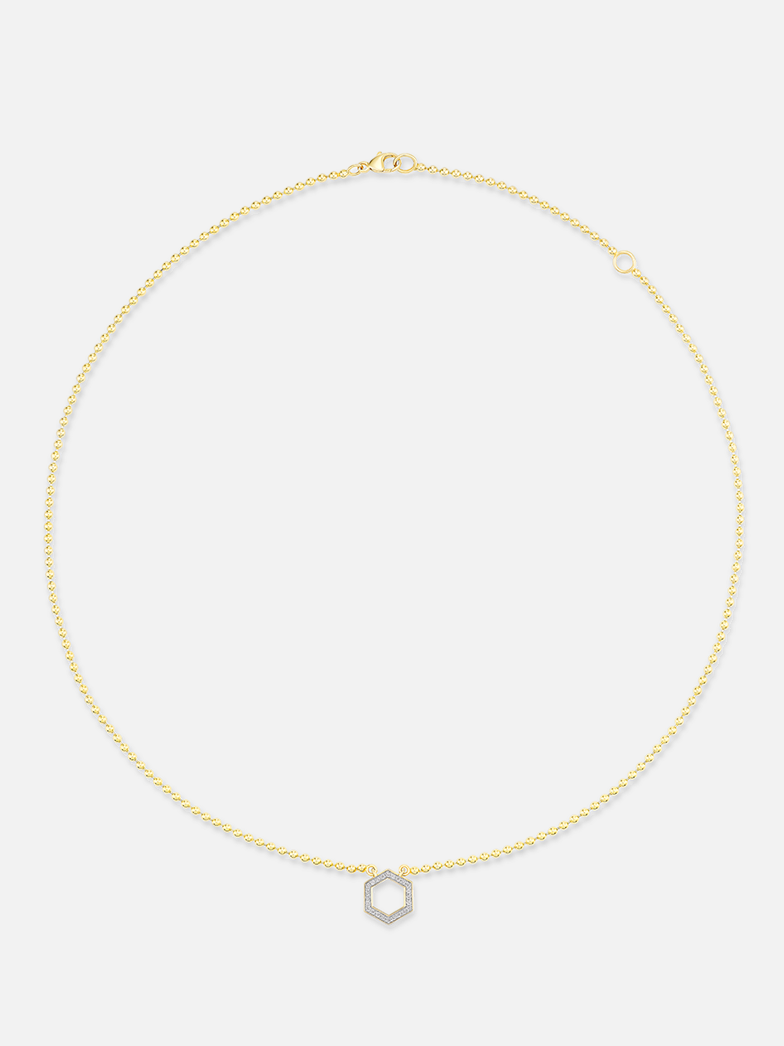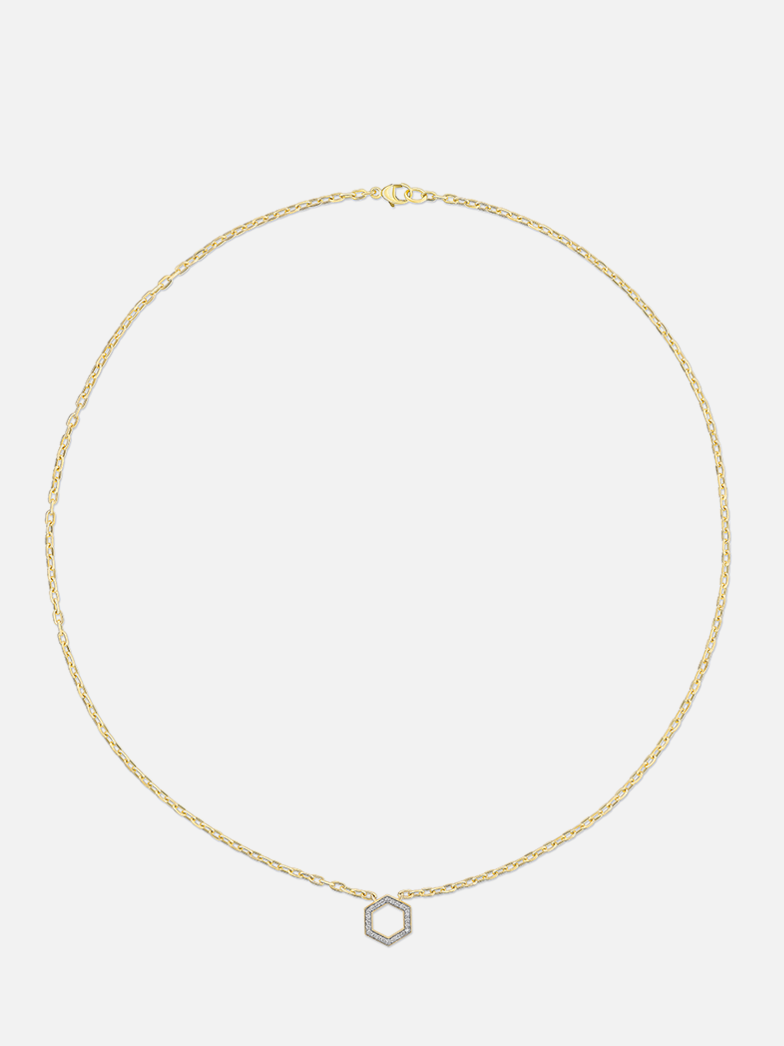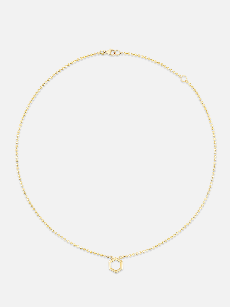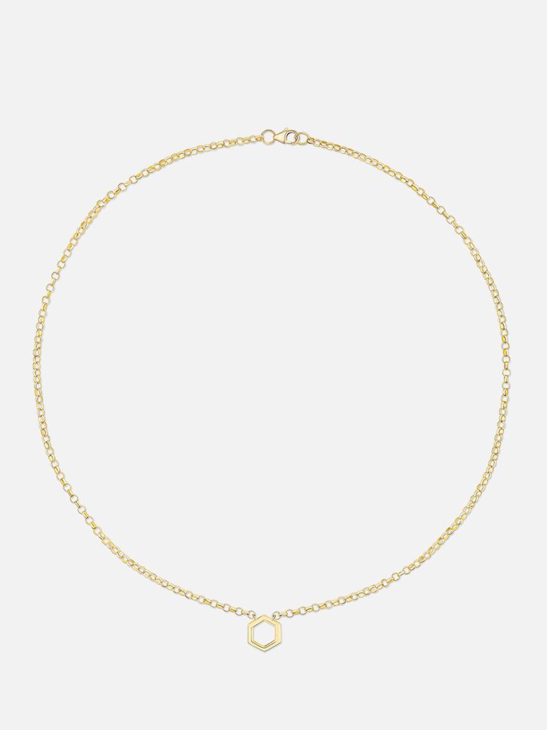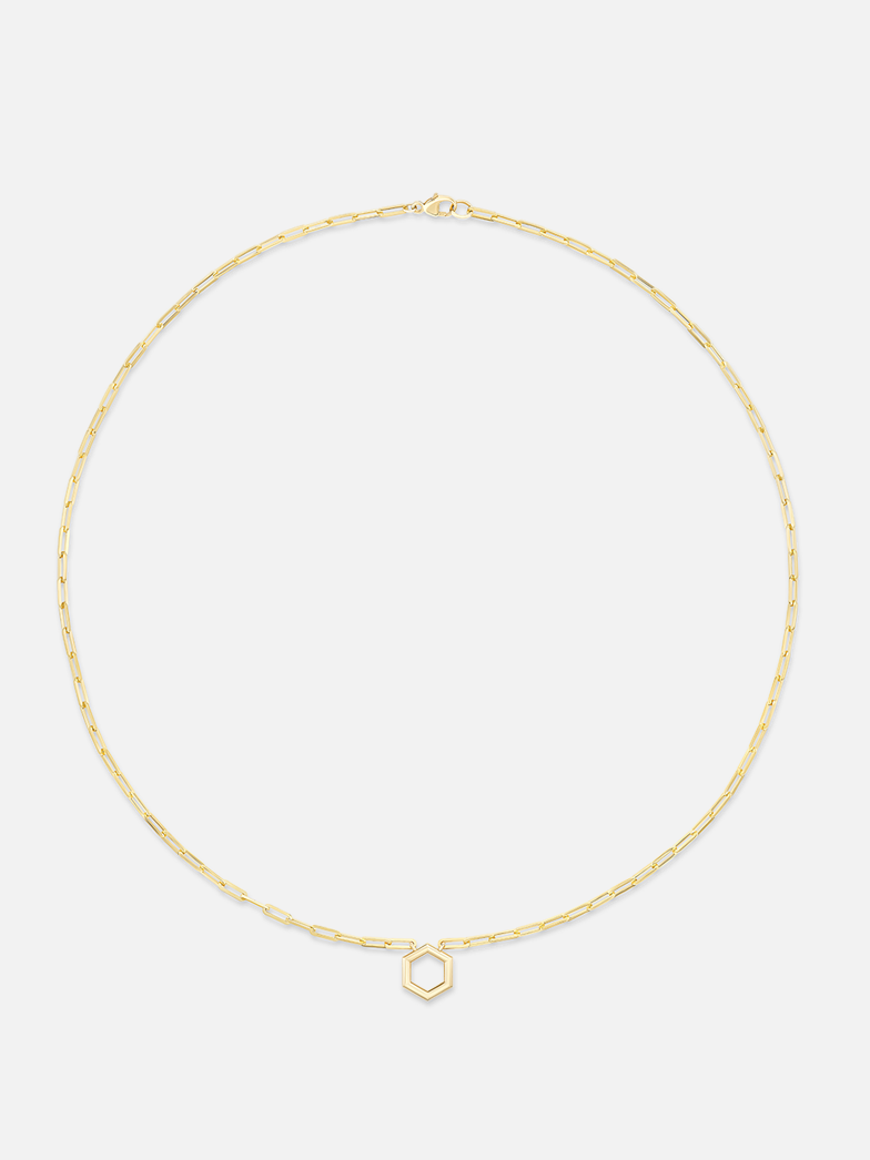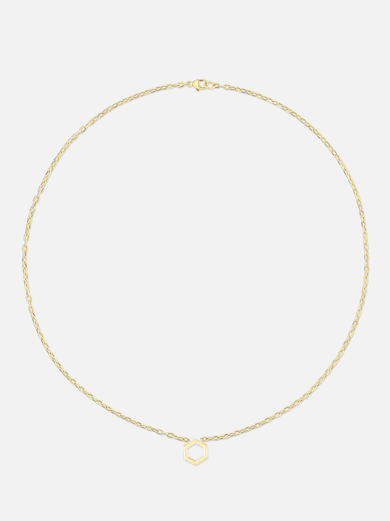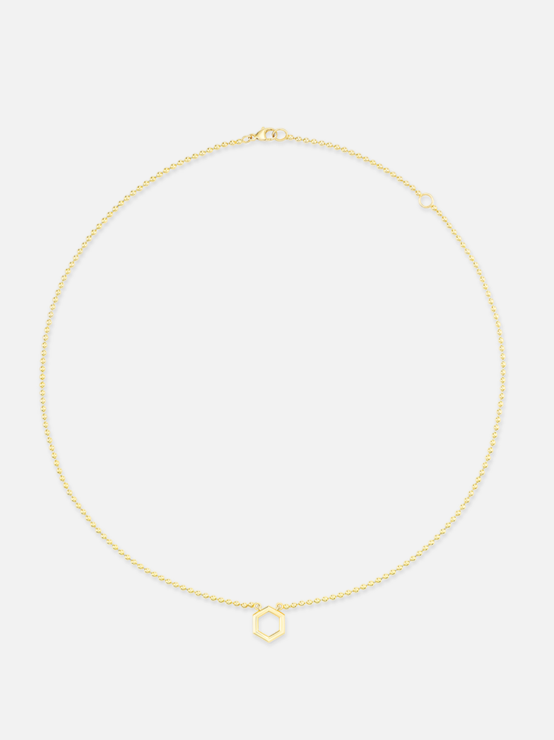 18k yellow gold mini hexagon foundation necklace, designed to be worn with signature open bail pendants. 16-18" adjustable