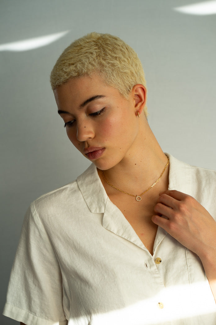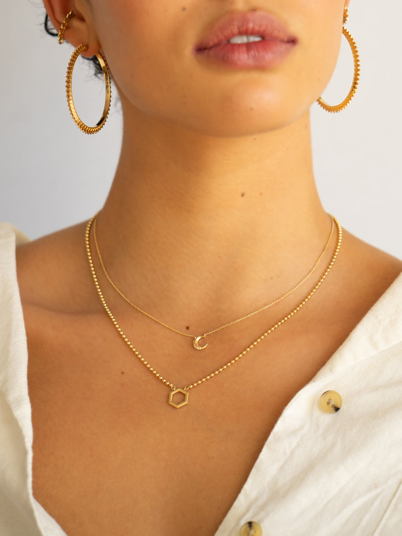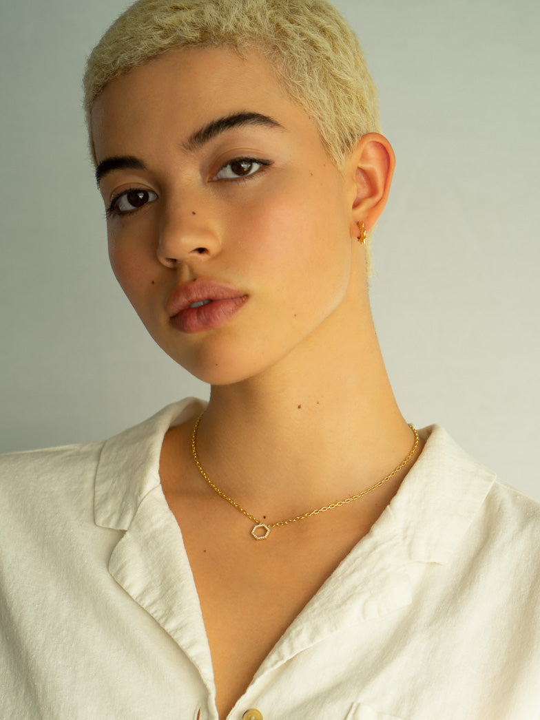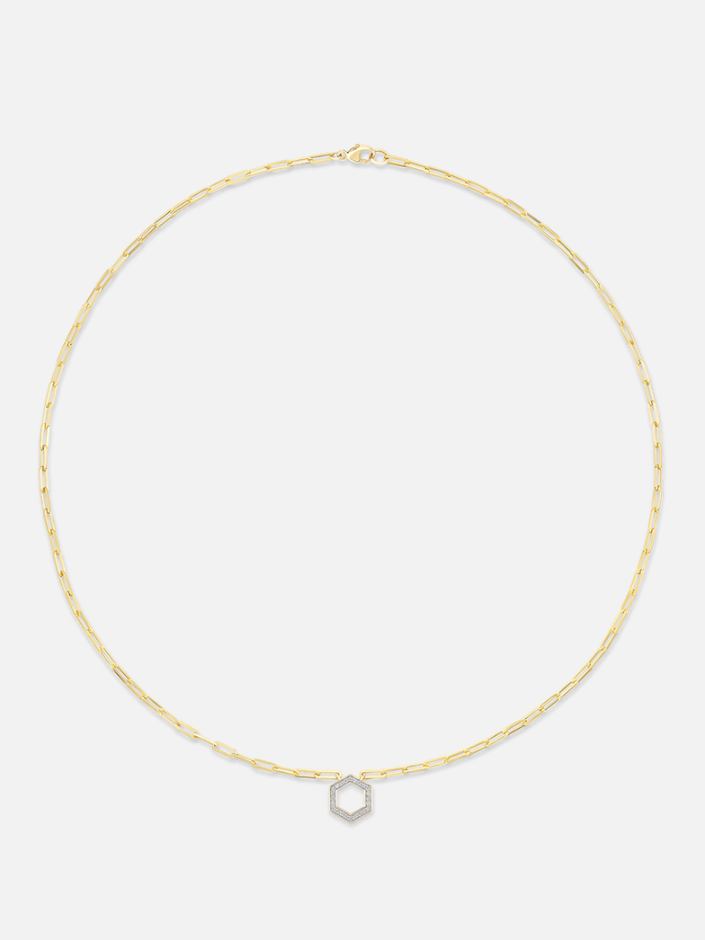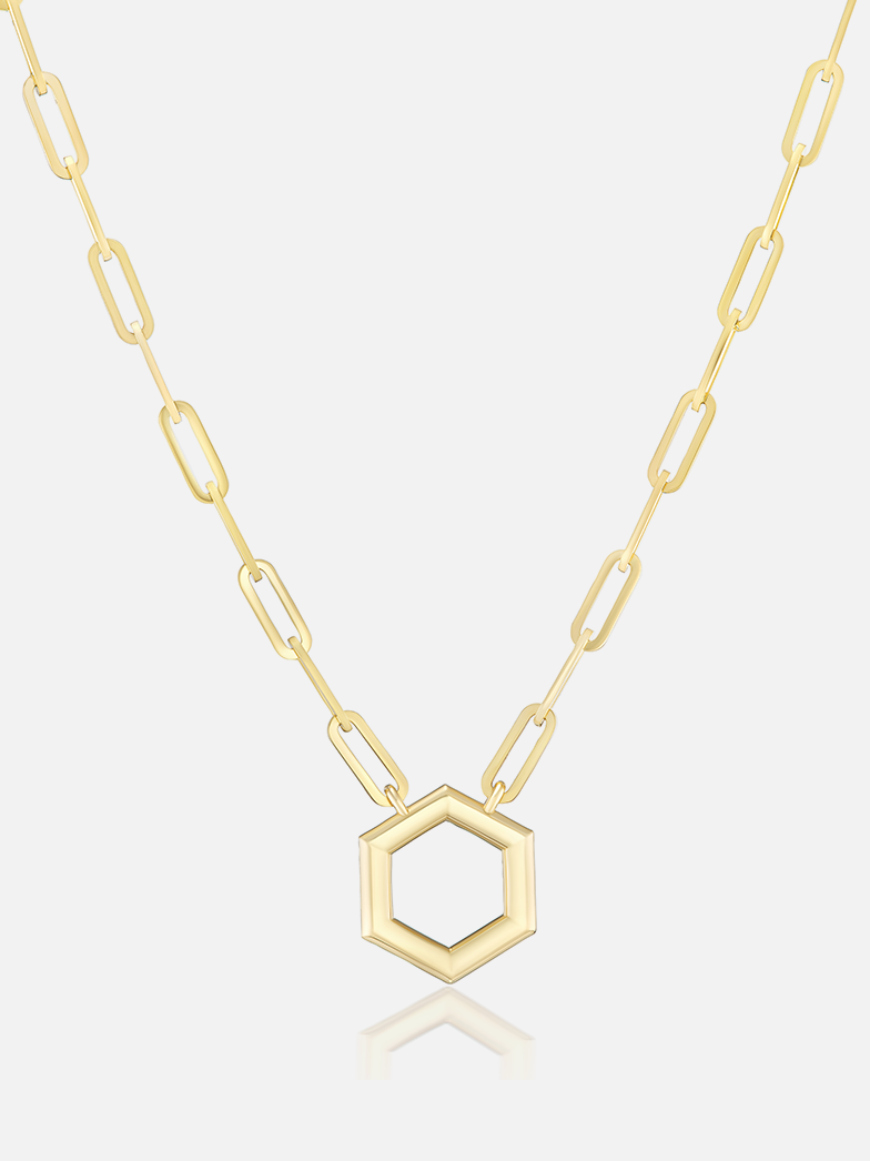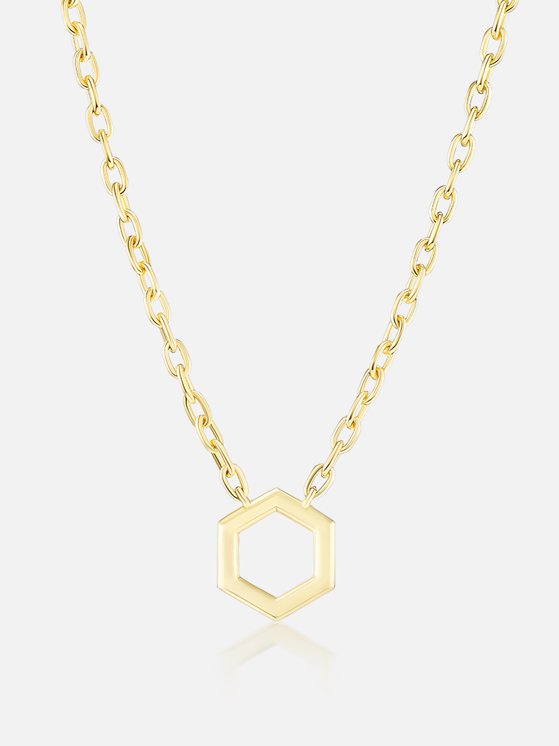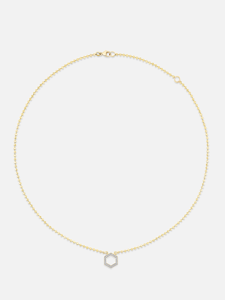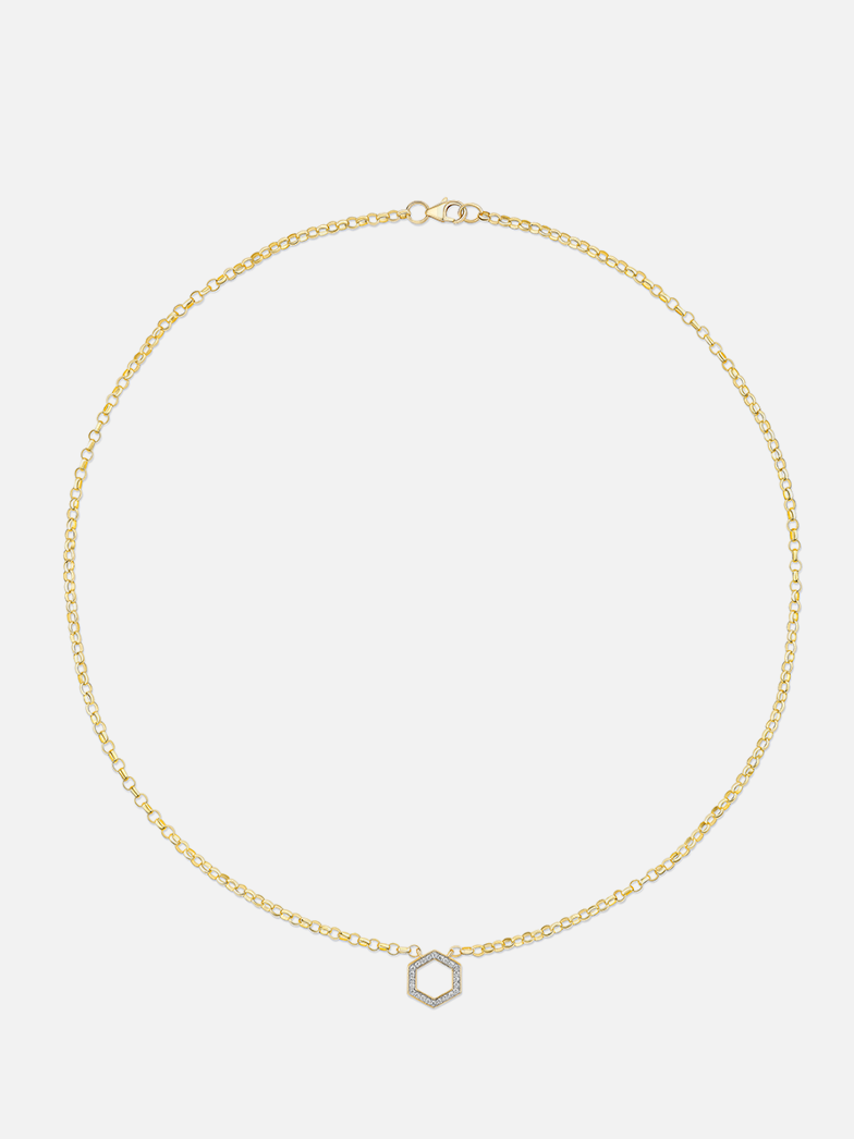 18k yellow gold mini hexagon foundation necklace, designed to be worn with signature open bail pendants. 16-18" adjustable