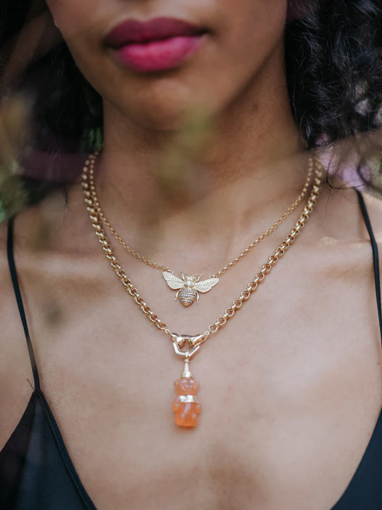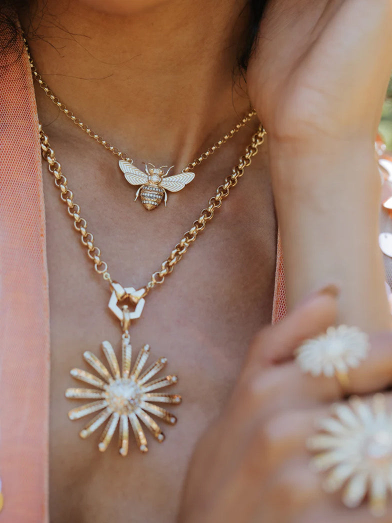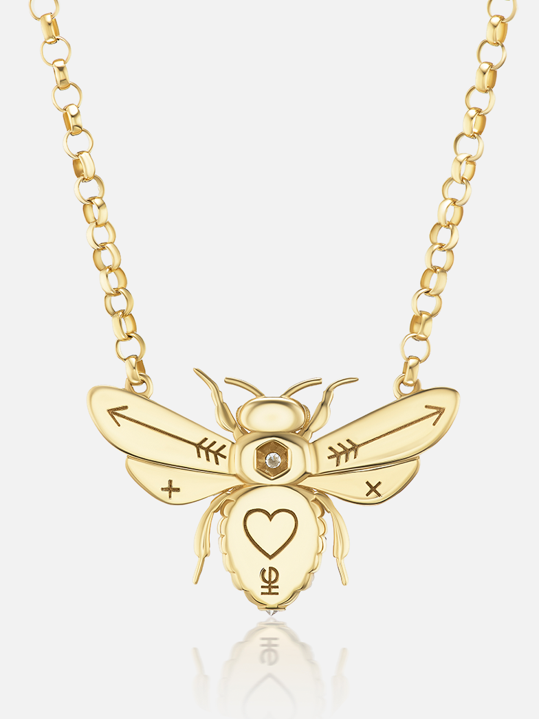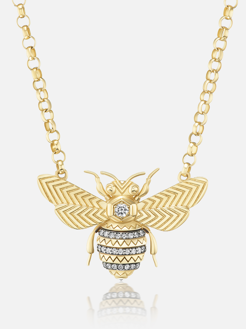 16-18" adjustable length rolo chain, 18K yellow gold, all gold bee pendant necklace with diamond details.