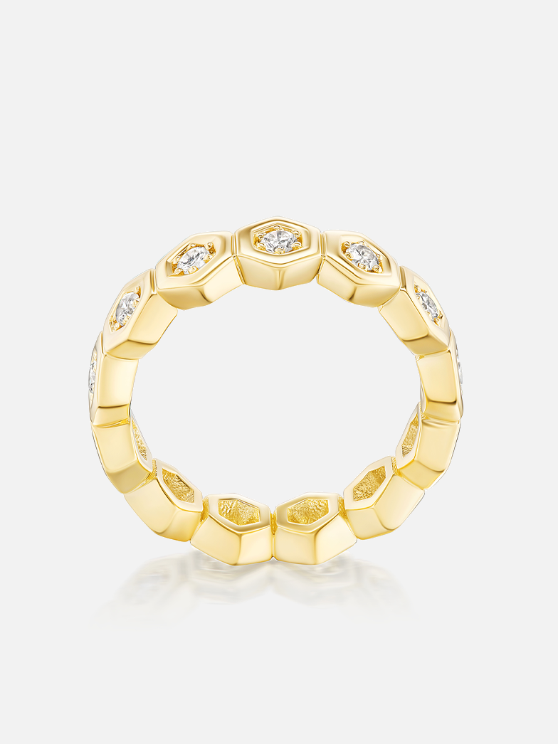 Made to order in 8-10 weeks. 18k yellow gold hexagon mini Hubba band with round diamonds.