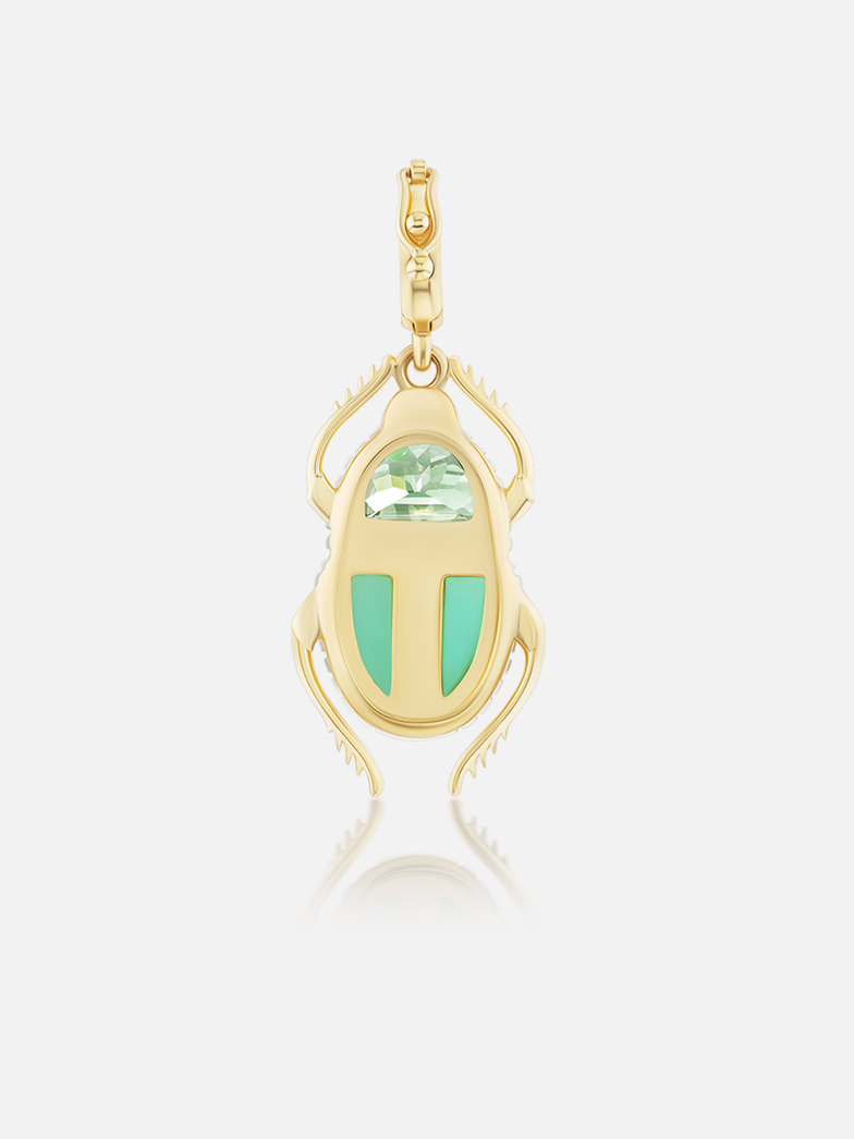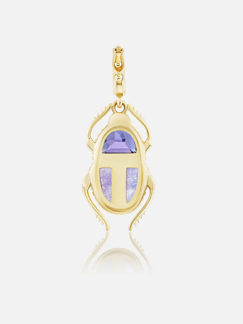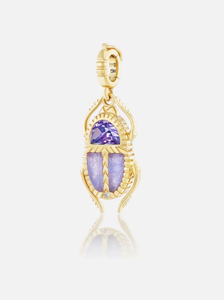 18k yellow gold, amethyst, purple jade and diamonds in this mini scarab pendant.