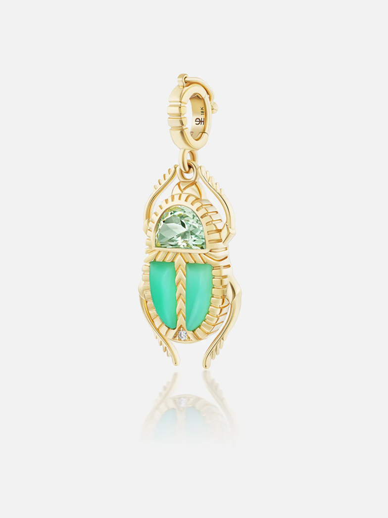According to our founder, Lauren Harwell Godfrey, “I began work on these Scarabs and then decided to take a trip to Egypt as I have long been fascinated by the ancient culture and it’s rich visual use of hieroglyphs and symbols. I especially love Scarabs for what they represent: rebirth and renewal. I was lucky enough to get one made in time to bring it to Egypt and take it to the pyramids and ancient sites where so many scarabs are represented in the art. My version features contrasting textures with faceted and smooth stones sourced in complementary colors. As is typical in my work there are patterns and engraving lines and lots of detail like the tiny little pyramids that define the center of the piece, set with sparkling diamonds."