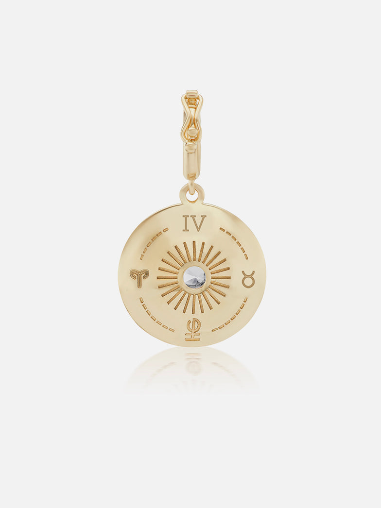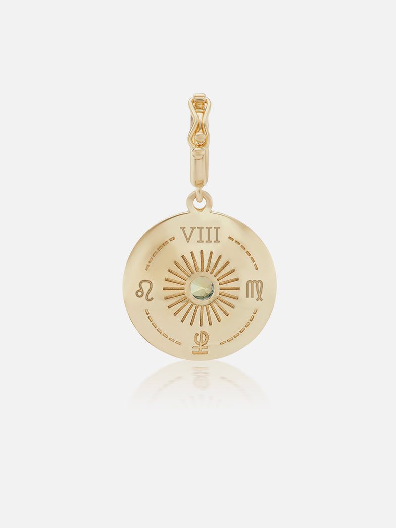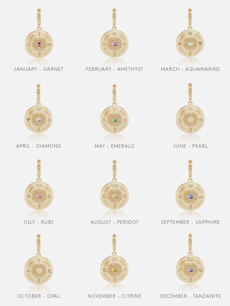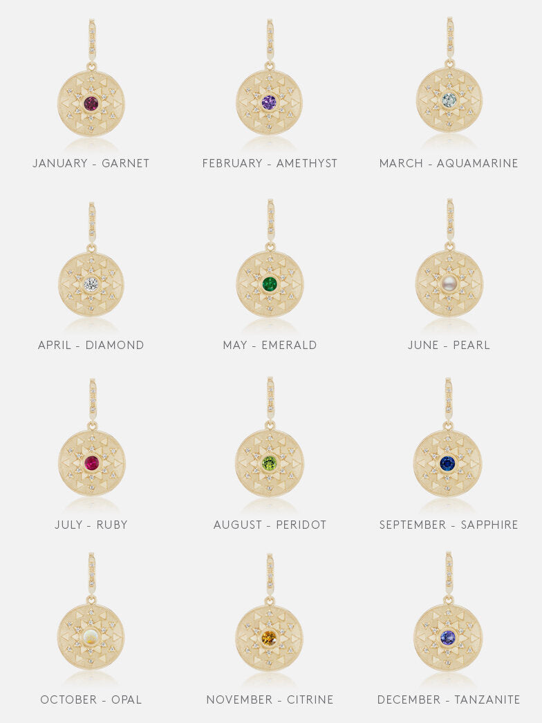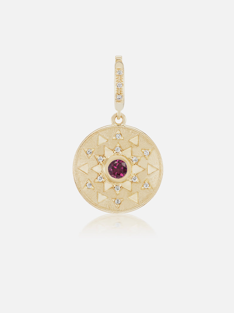 A must-have compliment to your HG Moon pendant (yes, it does nest effortlessly!) or a stunning standalone piece, these rich 18 karat gold discs are detailed with signature HG triangles radiating out from a dazzling center stone. Available in two sizes — Major and Mini — our new favorite talismans are offered in every birthstone in combination with pave diamond rays. As with most HG pieces, turn each medallion over for an added bonus: intricate engravings that correspond to the Sun’s center stone. A detachable enhancer allows you to clip it on and off whenever you need a little extra light in your life.