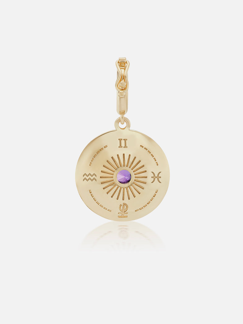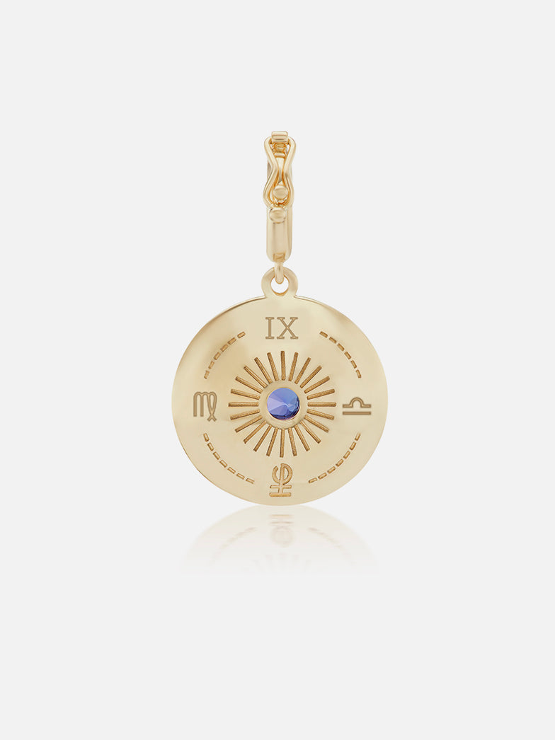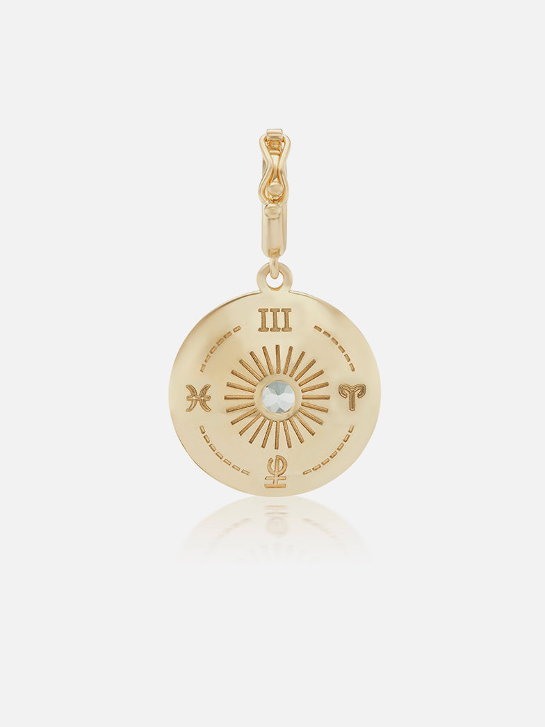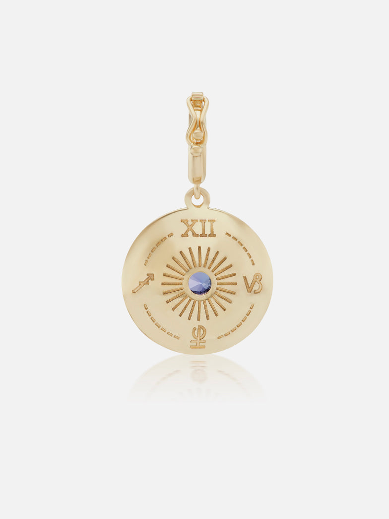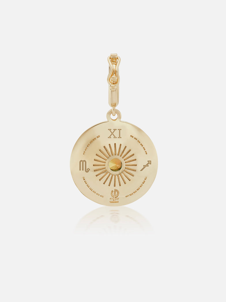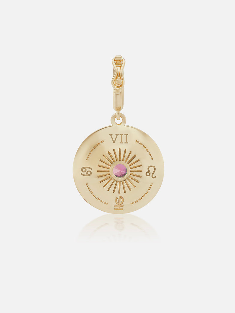 A must-have compliment to your HG Moon pendant (yes, it does nest effortlessly!) or a stunning standalone piece, these rich 18 karat gold discs are detailed with signature HG triangles radiating out from a dazzling center stone. Available in two sizes — Major and Mini — our new favorite talismans are offered in every birthstone in combination with pave diamond rays. As with most HG pieces, turn each medallion over for an added bonus: intricate engravings that correspond to the Sun’s center stone. A detachable enhancer allows you to clip it on and off whenever you need a little extra light in your life.