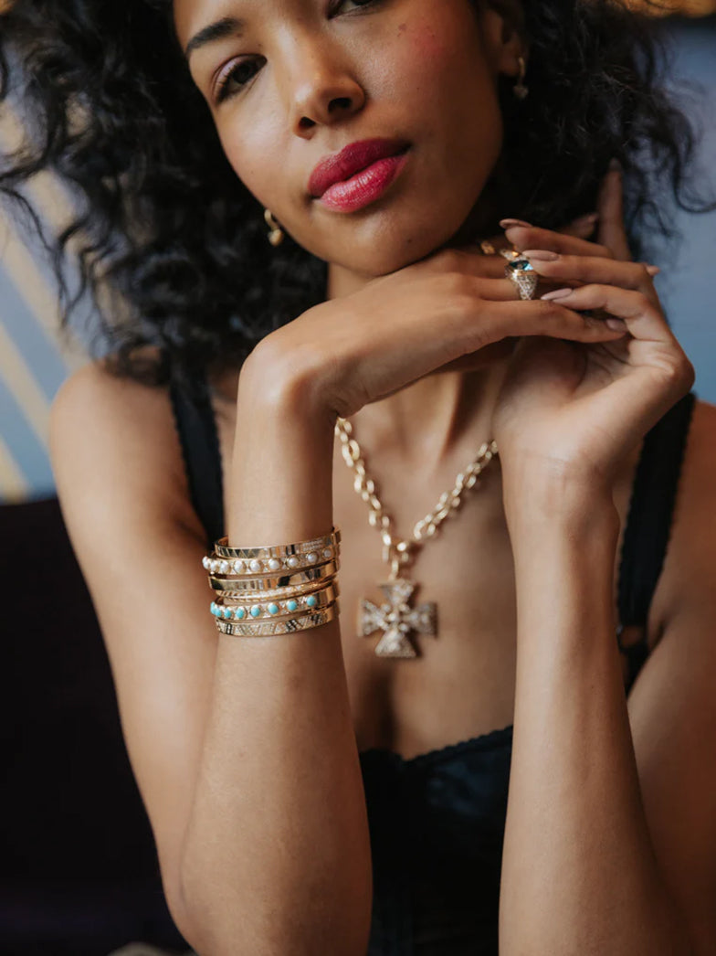 The perfect way to elevate your wrist stack, the Pearl Cabochon bangle is one-sided and features a comfortable single hinge for ease of wear. Looks great alone or paired with friends!