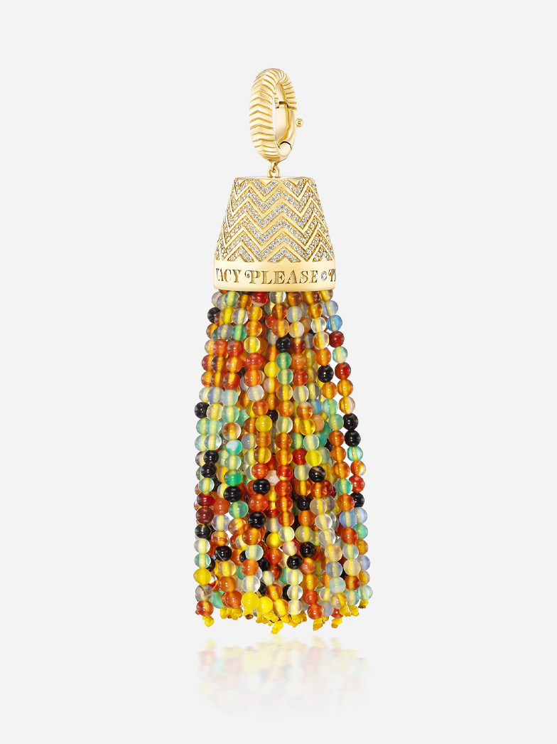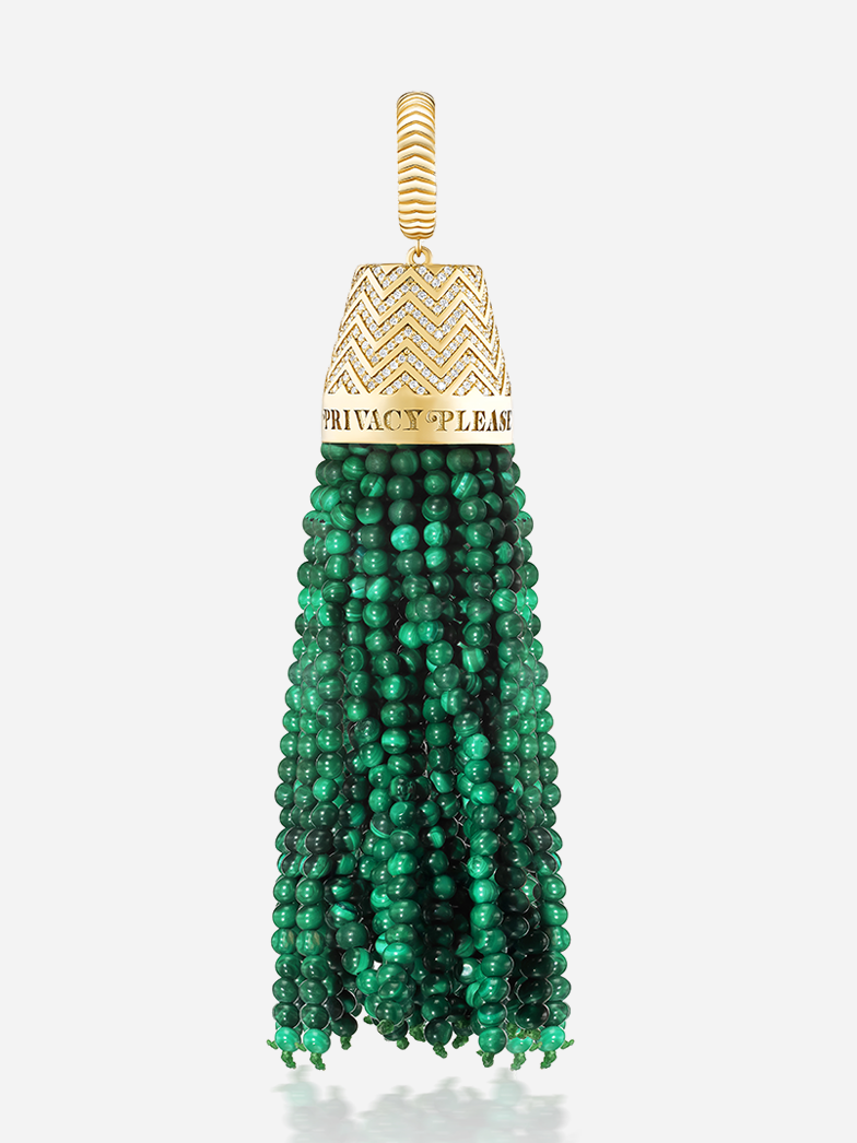 Made to order in 8-10 weeks. 18k yellow gold Privacy Please Keychain Tassel with diamond details and malachite beads. Necklace not included.