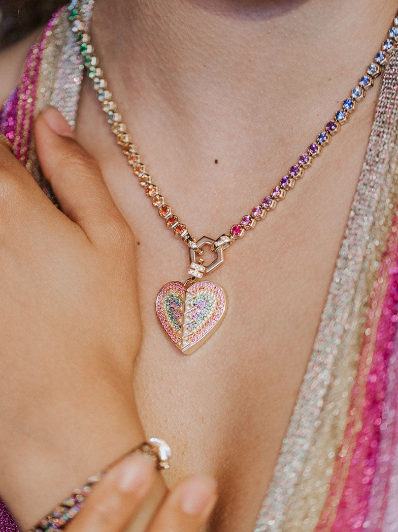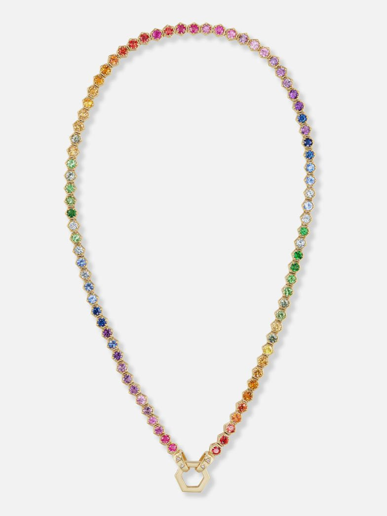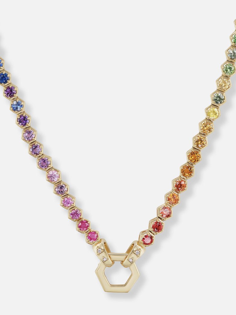 Our signature tennis necklace – one stunning row of hexagon bezel-set stones – is unexpectedly arranged with a rainbow of multicolored gems. Detachable on one end from the gold Foundation clasp, this necklace can be worn in a multitude of ways: with the Hexagon to the front alone, with the addition of charms, or to the back, allowing the rainbow effect to take center stage.