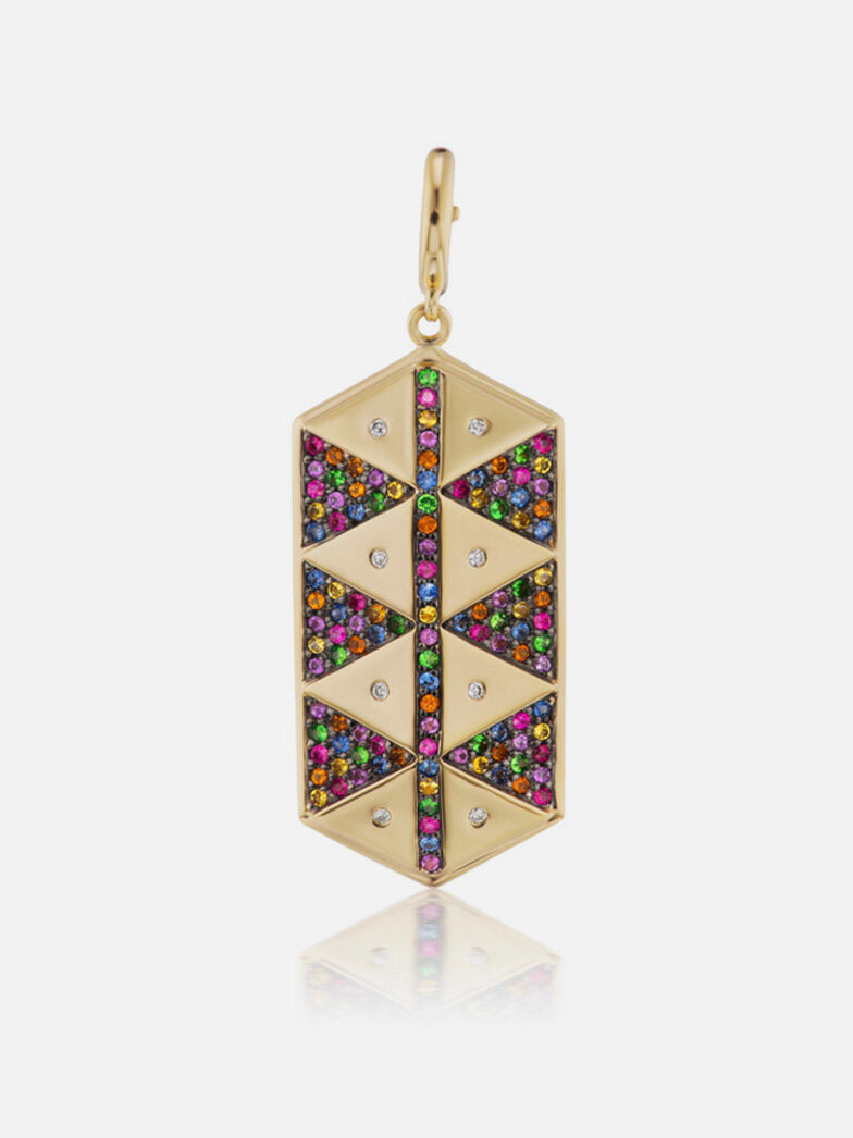 18K yellow gold, Shield Motif Medallion with gemstone details. Includes bail that opens to easily clip on to our Foundation necklaces.