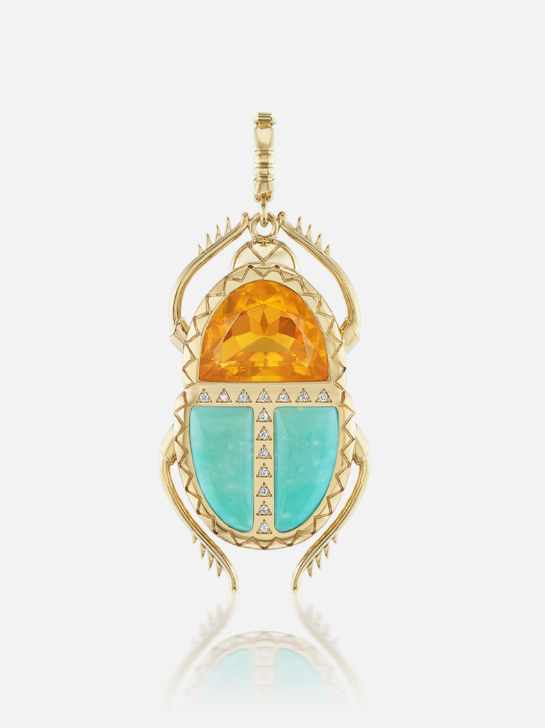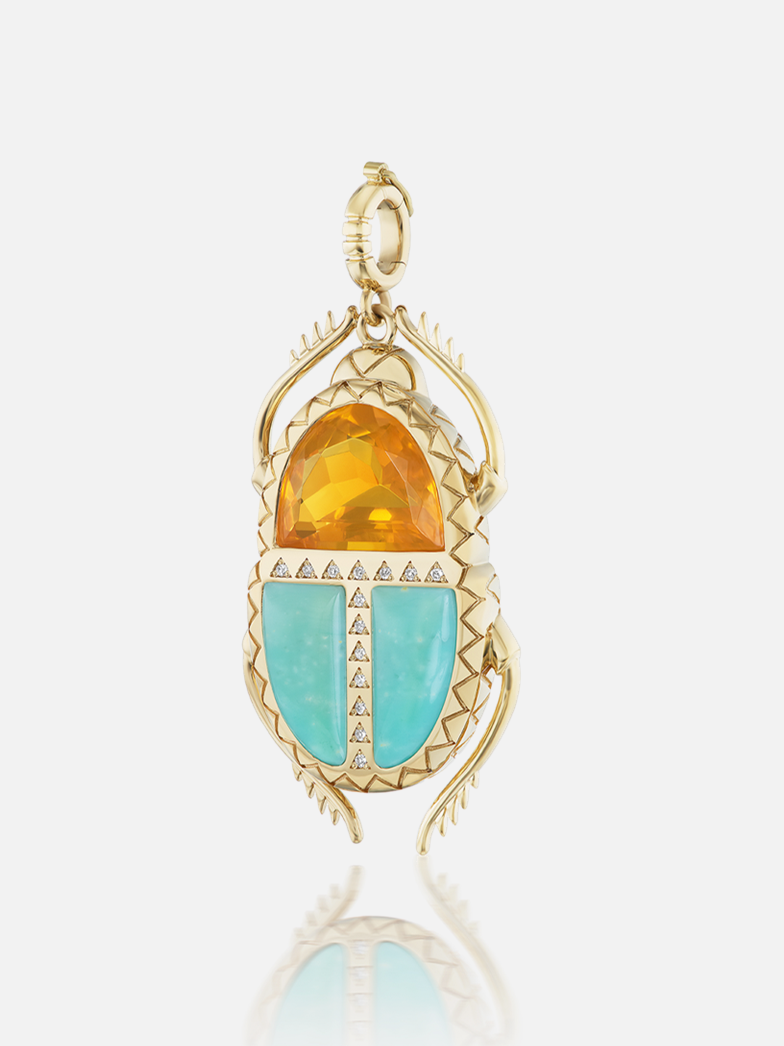 18k yellow gold, fire opal, wood opal and diamonds in this scarab pendant.