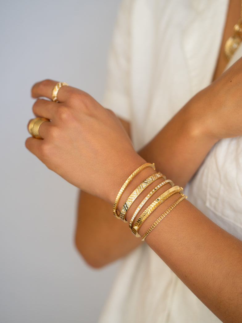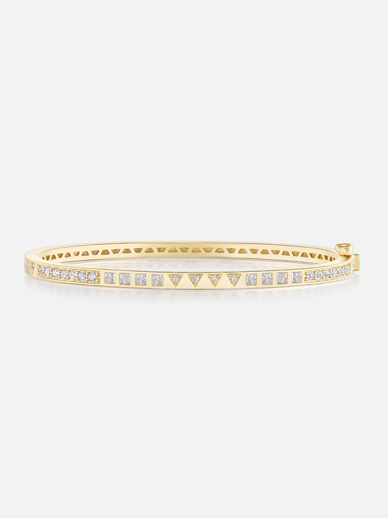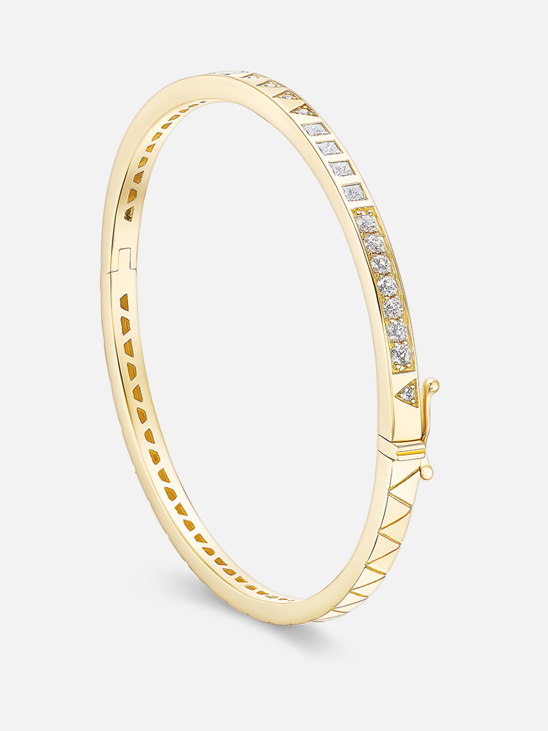 18k yellow gold skinny juju bangle with geometric diamond patterns and engraved details.
