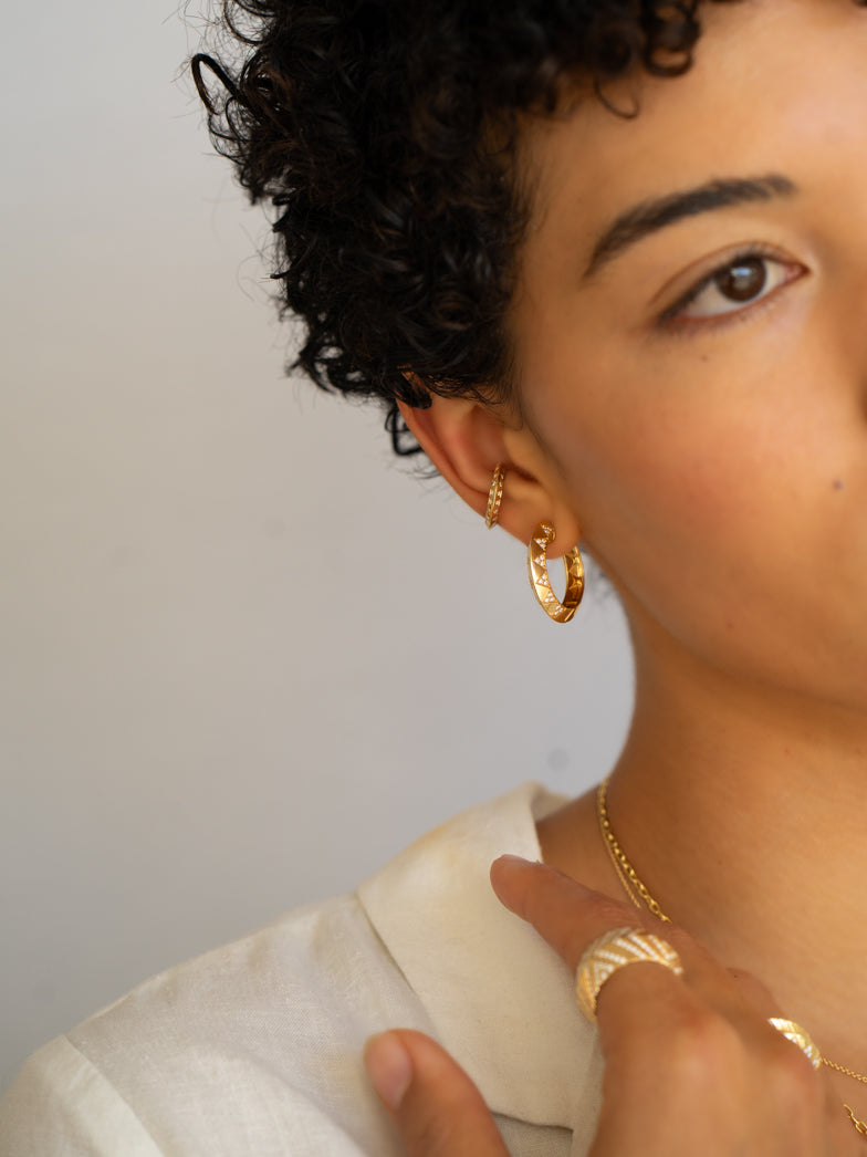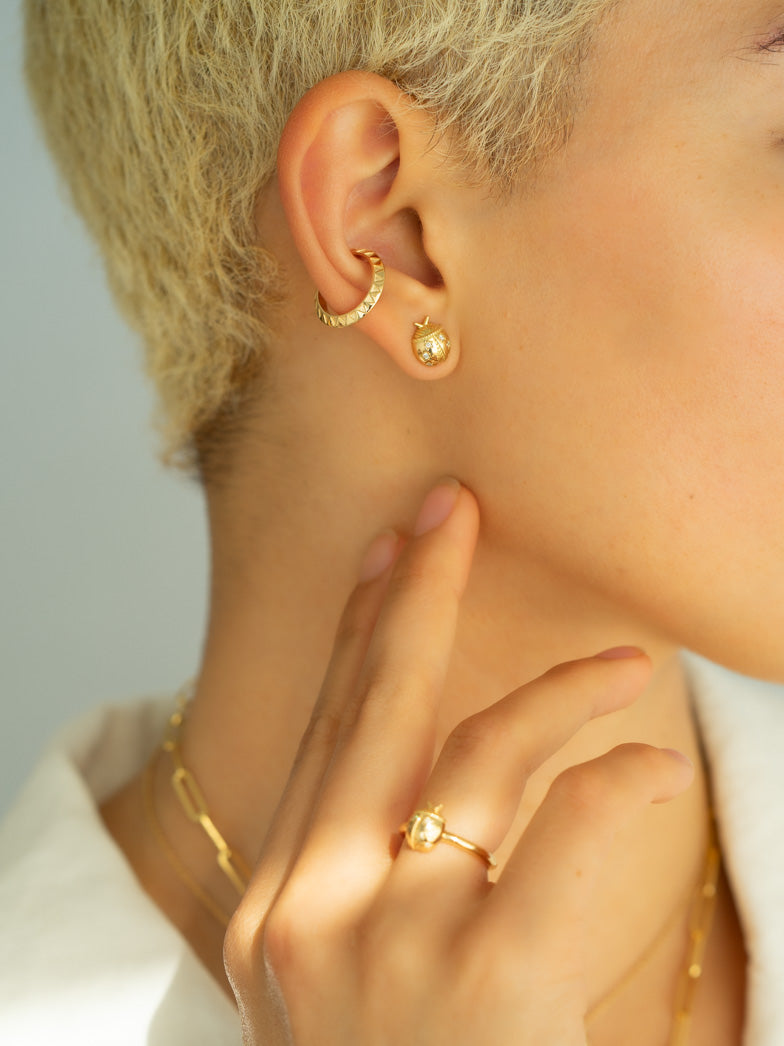 18k yellow gold skinny talisman ear cuff with raised triangle details and a textured finish. Sold as single.