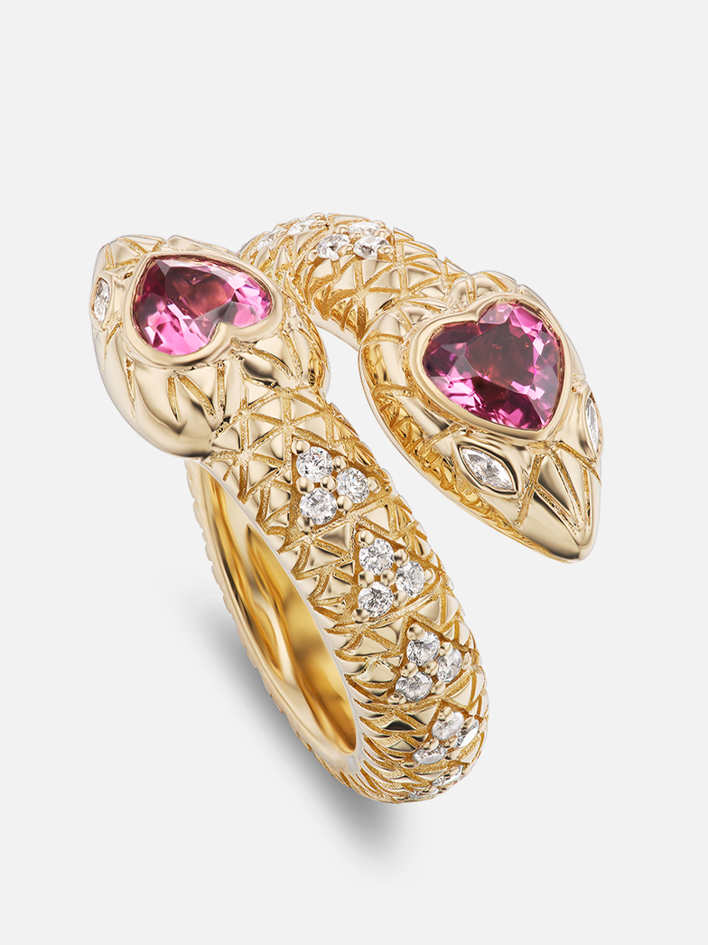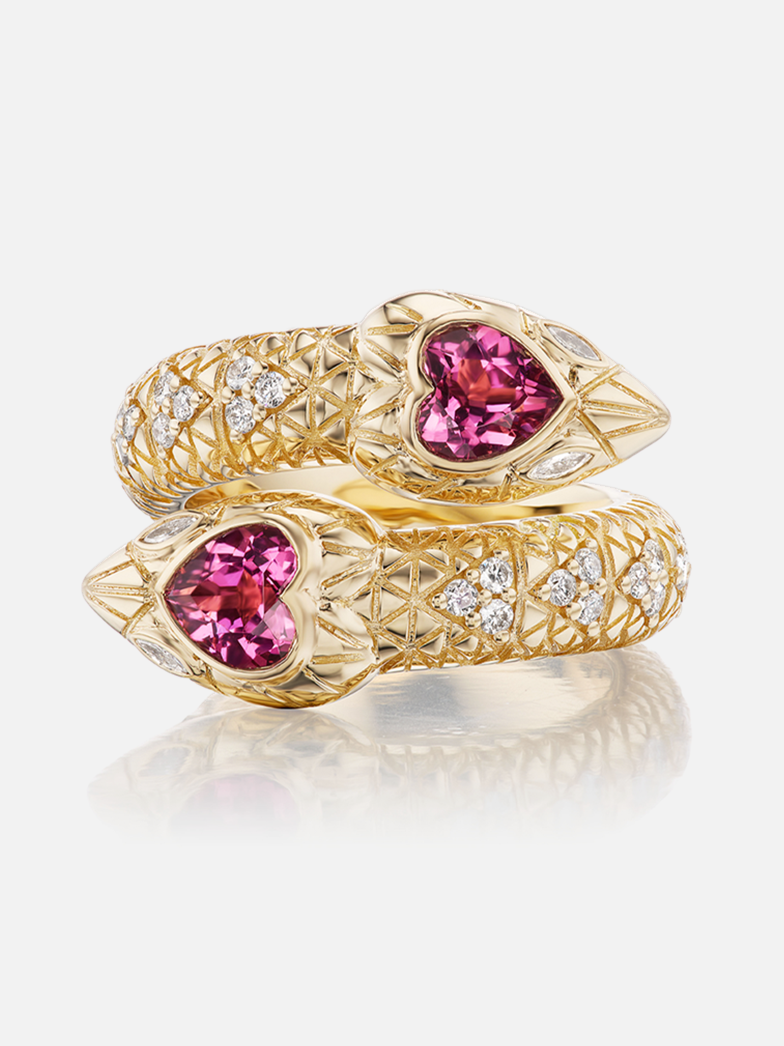 18k yellow gold snake ring with textured design, diamond and rubellite gemstones.