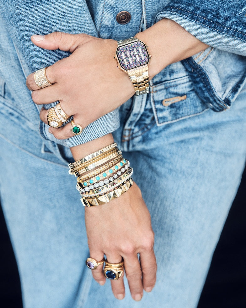 This limited edition 11:11 bracelet reads like an old school digital watch, but is made in solid 18k gold and detailed with multicolored gemstone pavé. Set eternally to read 11:11 and engraved on the back with the phrase “close your eyes and make a wish”, it was made to engage the wearer with those little whispers from their subconscious; personal longings and hopes that they might someday fulfill. It might be my favorite piece from our new Supernova collection.