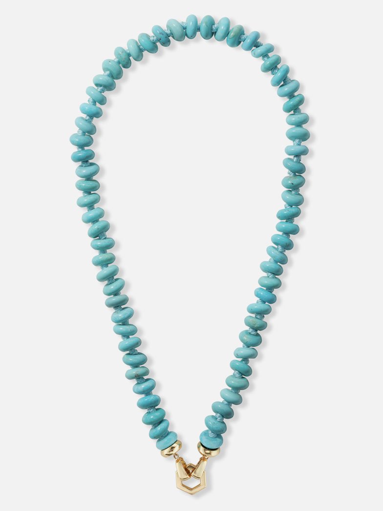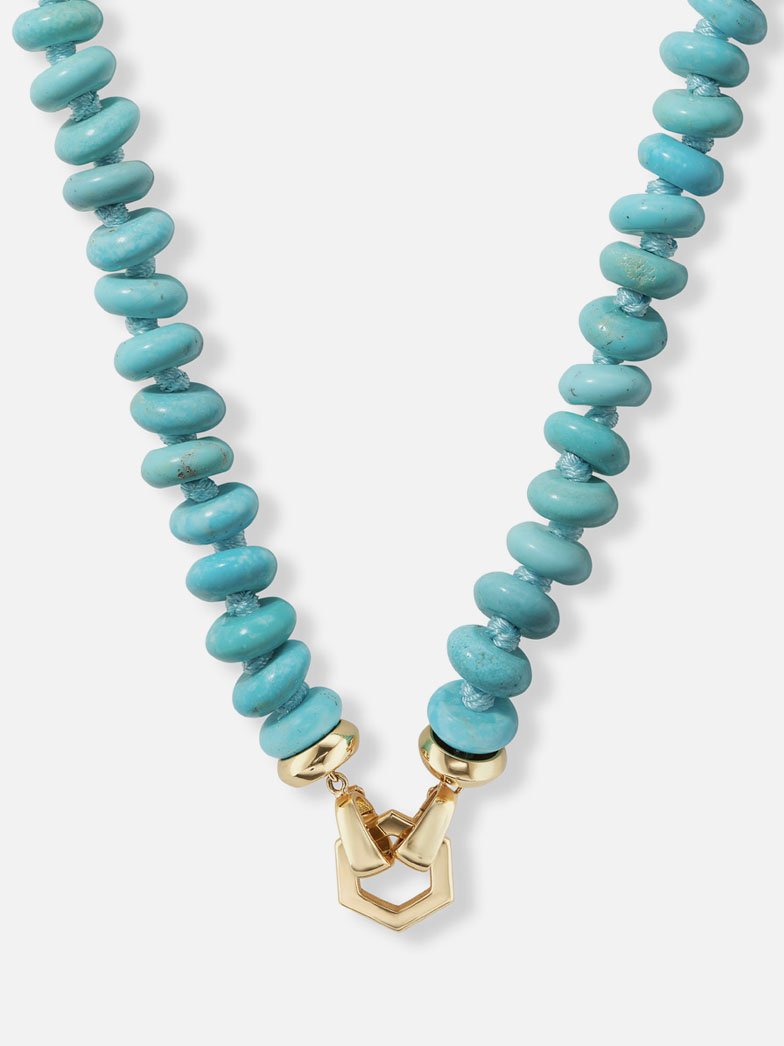 Made from a variety of individually hand-knotted and hand-chosen turquoise rondelles on coordinating silk. Detachable on one end from the gold Foundation clasp, this necklace can be worn in a multitude of ways: with the Hexagon to the front alone, with the addition of charms, or to the back, allowing the turquoise to take center stage.