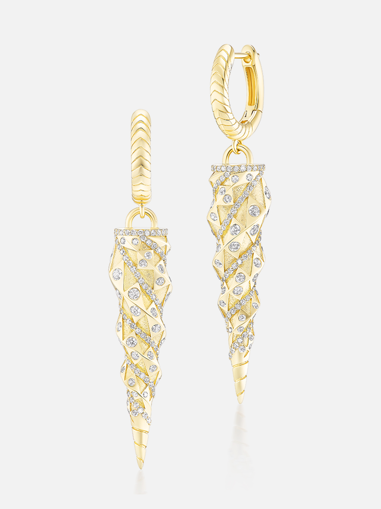 18k yellow gold unicorn drop huggie earrings with diamond details. Sold as a pair.
